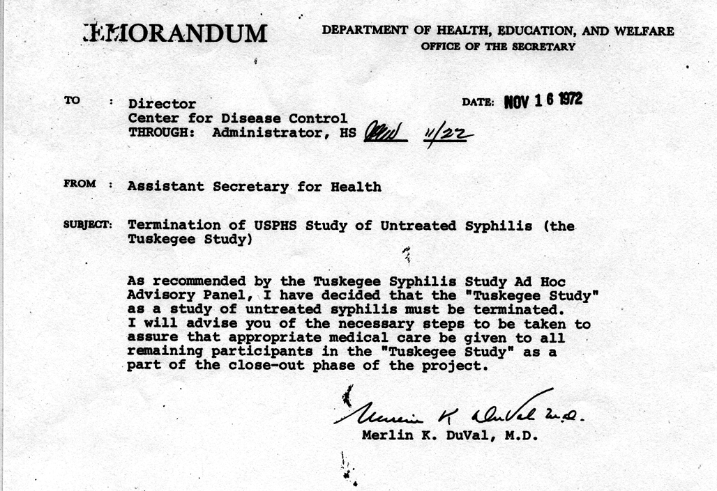 The clinical trial that was this Syphilis experiment was abandoned when funding ceased and the government knew about it. During Bill Clinton’s term of presidency, the ex-president apologized for the government’s wrong doing and assigned a task force for policing these type of trials. By the time this occurred, there was but one lone survivor of the experiment. The task force or “watch dog” was and is a weak form of action that still does not address any form of reparation for the victims and their families. It simply is a way of saying: This should not happen again, because clinical trials will be better regulated.